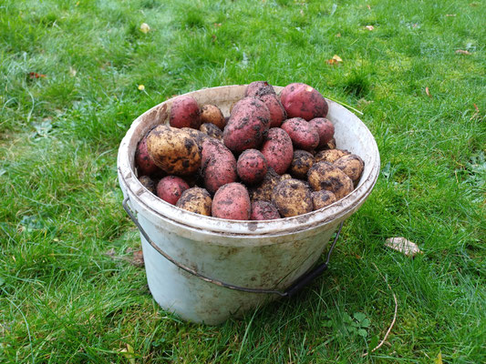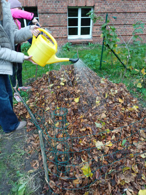 Nach den Herbstferien startete unsere Versuchsreihe: Erst die Kartoffeln heraus, dann Zaun herum und nun testen wir, wie viel Laub tatsächlich von Regenwürmern & Co. bis zum Frühling in Kompost umgewandelt wird. Weil es solchen Spaß macht, mussten die Blätter tüchtig gegossen werden - nicht, dass wir aus der Übung kommen.