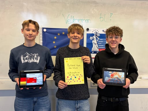 Die „Heißen Grüße aus dem Jahr 2025“, eine digitale Postkartensammlung mehrerer europäischer Staaten von Henry, Jonne und Tjorge (alle 10e) hat den schulinternen Wettbewerb gewonnen.