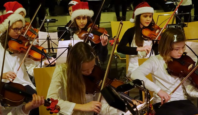 Am 21.12.2022 haben in der Aula der Schule die beiden Weihnachtskonzerte stattgefunden. Im ersten Konzert haben die Wahlpflichtkurse Musical und Streicher sowie das Vororchester gespielt. Im zweiten Konzert folgten dann der Mittelstufenchor und der Oberstufenchor sowie die Big Band La Banda Viktoria und das Orchester.