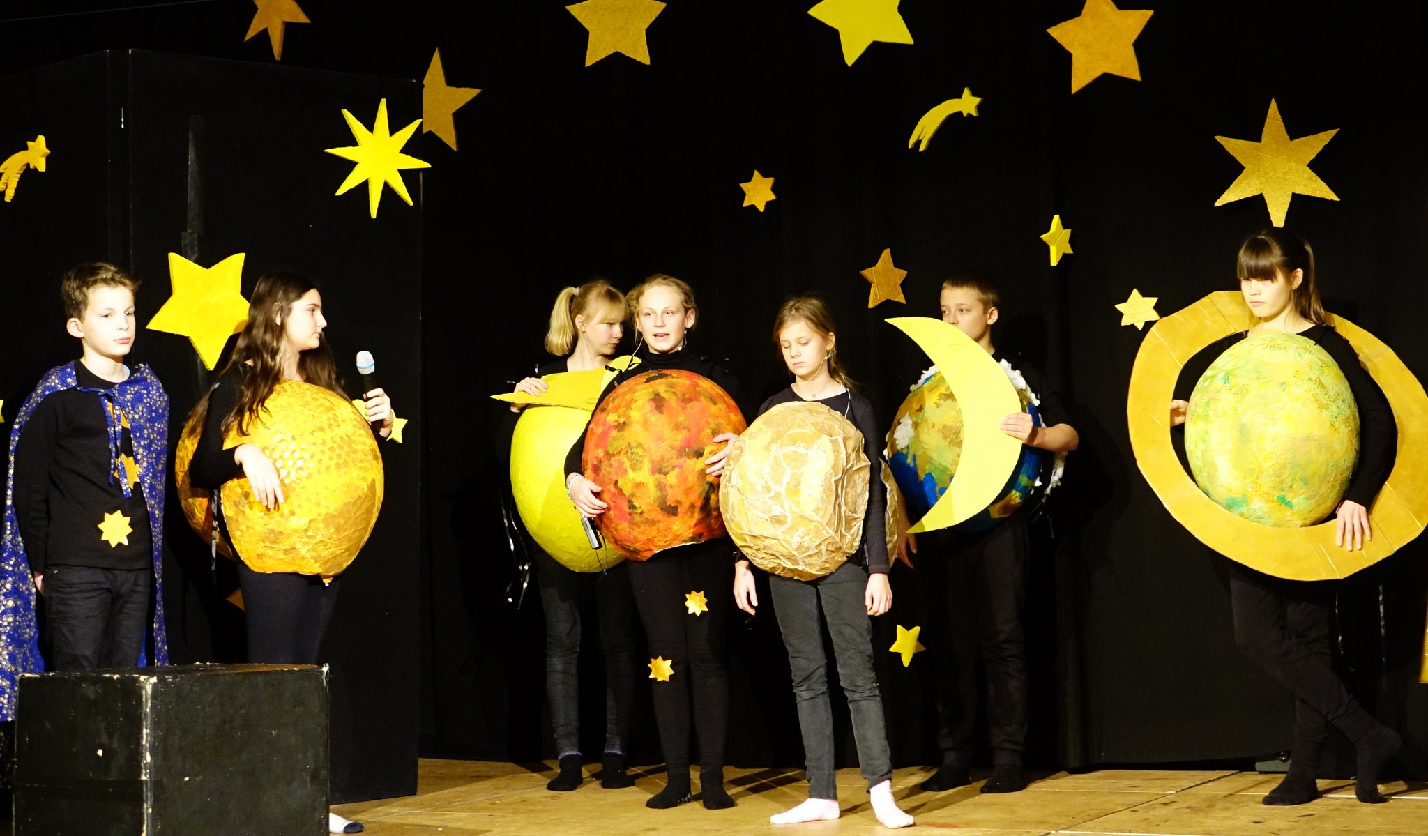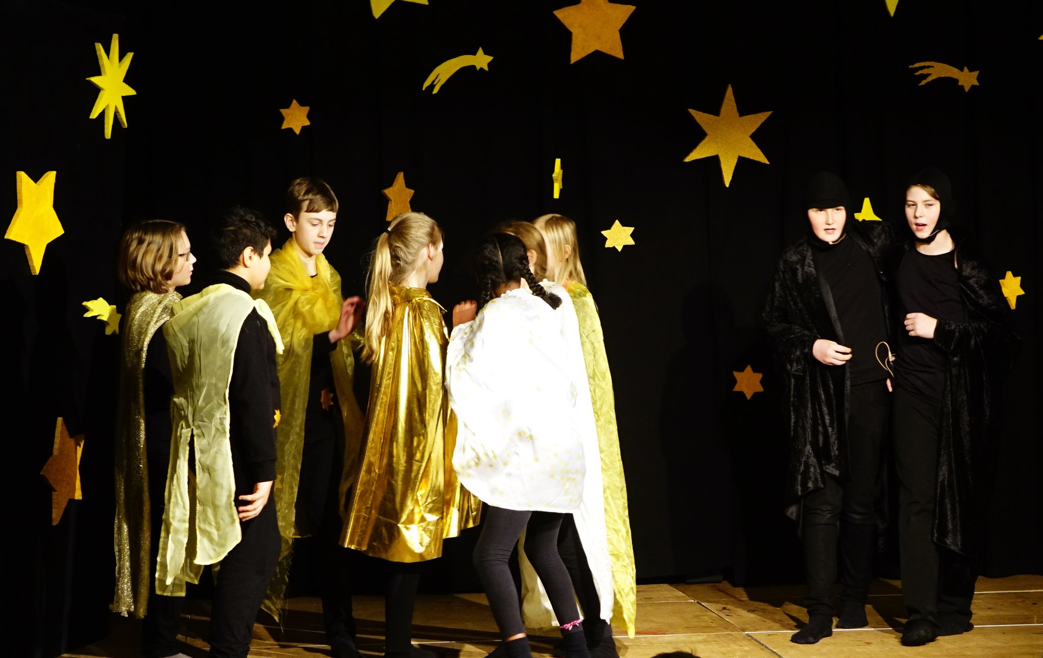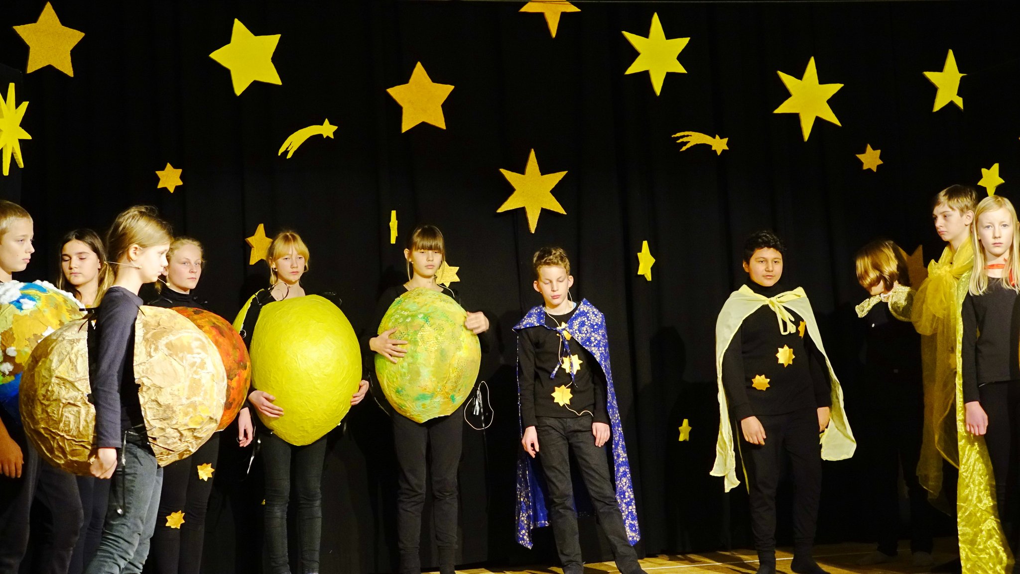 Am 8. Juni präsentierte das Musikprofil des 10. Jahrgangs die Ergebnisse ihres fächerübergreifenden Projekts zum Thema „Revolution“. Beteiligt waren die Fächer Musik, Geschichte und darstellendes Spiel. Zwei Kleingruppen führten jeweils eine selbst entwickelte Szene mit Musik zu „Mauerfall“ bzw. „Reformation“ auf. Die Szenen wurden musikalisch umrahmt von zwei Songs zum Thema Revolution sowie Chopins „Revolutionsetüde“, virtuos dargeboten von Sara Mai.