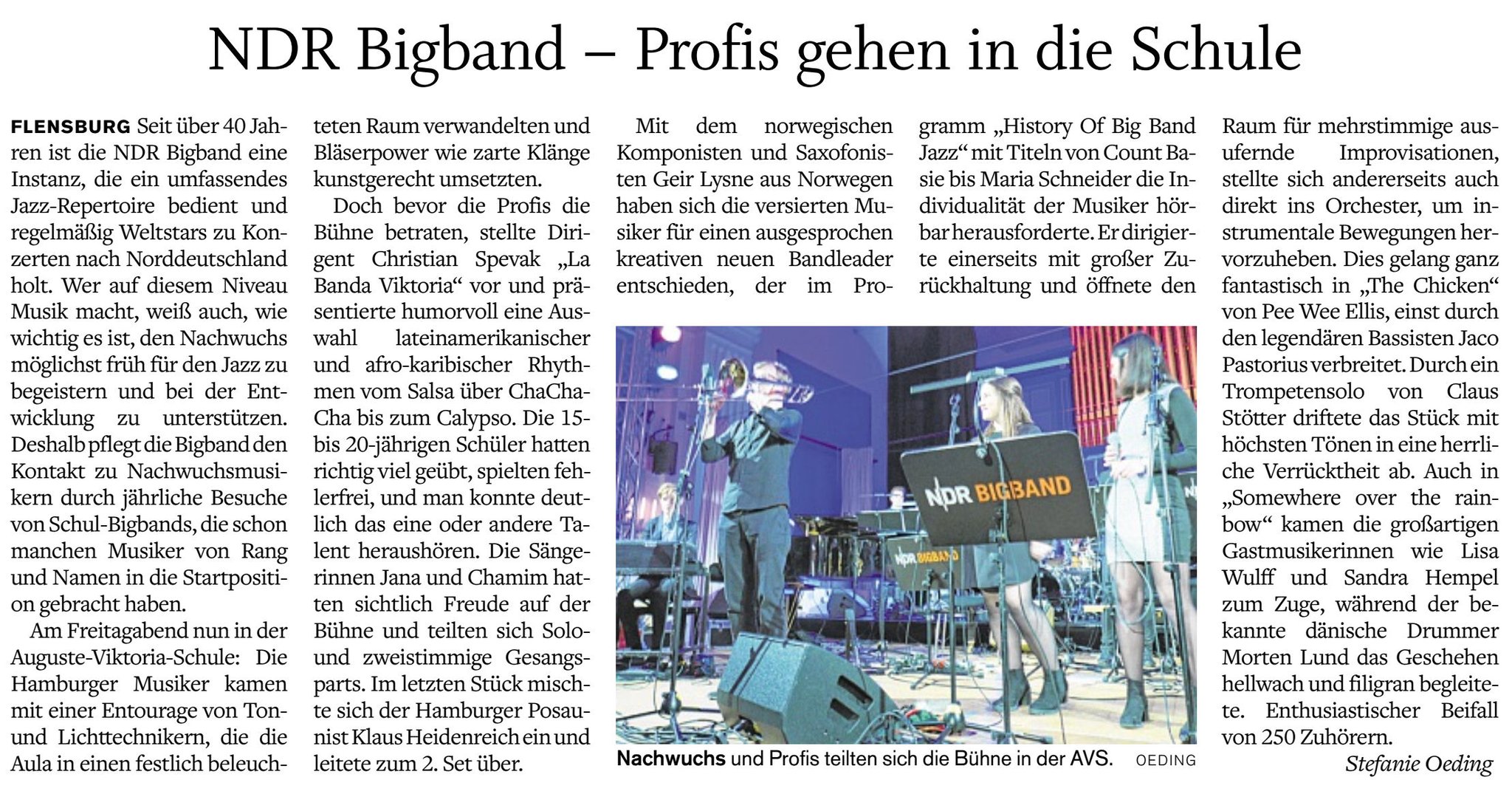 Am 24. Februar 2017 war es endlich soweit. Unter dem Motto "School's out - it's Bigband time" teilte sich die AVS-Band "La Banda Viktoria" eine Bühne mit der NDR Bigband. Die Schülergruppe spielte unter der Leitung von Christian Spevak ein spektakuläres Konzert vor 250 Zuschauern in der Aula der Auguste-Viktoria-Schule. Im zweiten Teil zeigten die Musiker der NDR Bigband dann ihr Können. Einige Eindrücke sowie den Zeitungsbericht des Flensburger Tageblatts befinden sich in der Galerie.
