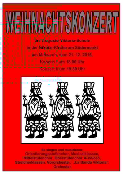 Am 16.12.2015 hat unser Weihnachtskonzert in der Kirche St. Nikolai am Südermarkt stattgefunden. Getrennt in zwei Blöcken haben das Vororchester, die Chor- und Streicherklassen, der Mittelstufenchor, der Oberstufenchor, das Orchoster sowie die die Big Band zu einem erfolgreichen Abend beigetragen. Einige Eindrücke des Abends sind in der Galerie zu sehen.