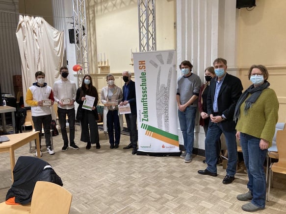 Die Auguste-Viktoria-Schule konnte sich im Schuljahr 2020/2021 als Zukunftsschule zertifizieren lassen. Herr Hansen, Kreisfachberater für Bildung für Nachhaltige Entwicklung, prämierte im Rahmen der Schulkonferenz am 25.5.21 die AVS als Zukunftsschule der Stufe 2, da aufgrund der Corona-Pandemie dieses Jahr keine große Prämierungsveranstaltung möglich war. Ausgezeichnet wurden zwei Projekte: Zum einem die Schülerfirma AVS Industries mit dem Makerspace, die im Rahmen des Junior-Programmes des IWD Köln personalisierte Masken herstellte. Zum anderen die Baltic Sea Conference, die sich dieses Schuljahr im Rahmen von Erasmus+ mit dem Thema „Our Spaces“ auseinandergesetzt hat. Herr Hansen würdigte das Engagement der Schüler und Schülerinnen für die nachhaltige Bildung. Gerne nahm Herr Dr. Eckert für die Schulgemeinschaft Urkunde, Kachel und Scheck entgegen.
