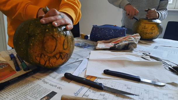 Pünktlich nach den Herbstferien haben wir unsere, seit Mai gehegten, Kürbisse geerntet - und angemessen verarbeitet. Die ersten Ergebnisse der Panzerbeeren findet ihr auf dem Außengelände. Wer entdeckt die gut versteckten Exemplare? Kleiner Tipp: Anfangs sahen sie noch so aus (siehe Bild unten).